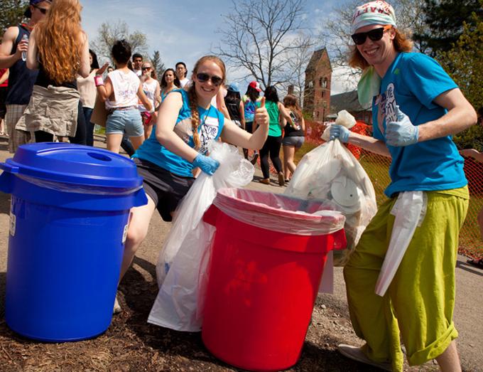 Aiming to be carbon neutral by 2020, AU is off to a strong start, with 30 buildings on track for LEED Silver certification, a 27-kilowatt solar array, D.C.'s biggest solar hot-water system, and a contraption called the Vegawatt, which turns old cooking oil into electricity. The university's plan is to divert 100 percent of its waste, and it's already two-thirds of the way there, thanks to a new campus-wide composting program, trayless dining (which reduced food waste by a third), quarterly e-waste drives, and such enthusiastic student participation that AU won last year's national RecycleMania competition. Students also get excited about the annual Campus Beautification Day (shown above), a springtime tradition that brings the AU community together to make the campus greener.