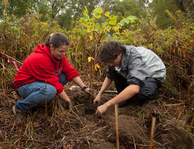 With grounds as verdant as its name, GMC is a tiny school in Poultney, Vermont, that describes itself as "a liberal-arts college emphasizing environmental sustainability." One of the first U.S. universities to achieve climate neutrality, it has a $5.8 million biomass plant that burns locally sourced woodchips (instead of fuel oil) to heat 85 percent and power 20 percent of the campus's two dozen buildings. Since 2006, GMC has also sourced 1.2 million kilowatt-hours of its energy per year from cows. Students visit local farms to learn about the bovine methane-generating process and are required to take a 37-credit environmental curriculum, which is delivered in LEED-certified classrooms. Above, GMC students plant trees to create a riparian buffer along the banks of the Poultney River.
