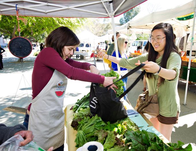 Last year's "Cool Schools" winner, an agricultural-education powerhouse, churns out research that helps shape California's water laws and push new farming practices into the mainstream. Its West Village, a neighborhood for students and staff, is America's biggest planned zero-net-energy community. UC Davis's climate action plan has already cut campus emissions to below year-2000 levels. Recycling, composting, and reuse divert more than 60 percent of would-be trash from landfills, and the Aggies aim to lift that percentage to 100 by 2020. In the photo above, freshman Julia Wasielewski fills junior Soo Lee's bag with local produce at the on-campus farmers' market, a weekly event during fall and spring quarters.